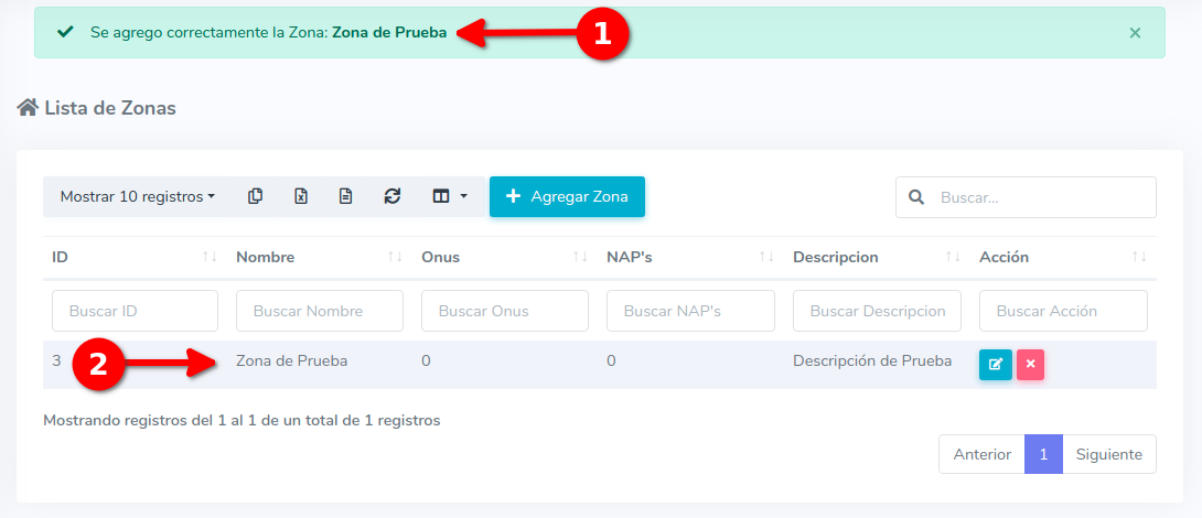 4Una vez guardada nos regresara a la lista de zonas donde podremos ver un mensaje confirmando que se agregado correctamente, tambien podremos verla en la lista de zonas.