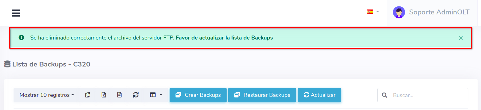 Al realizar estos pasos en su terminal, la OLT creara y mandara un respaldo en el servidor FTP de AdminOLT, el cual puede ser visualizado en la Lista de Backups