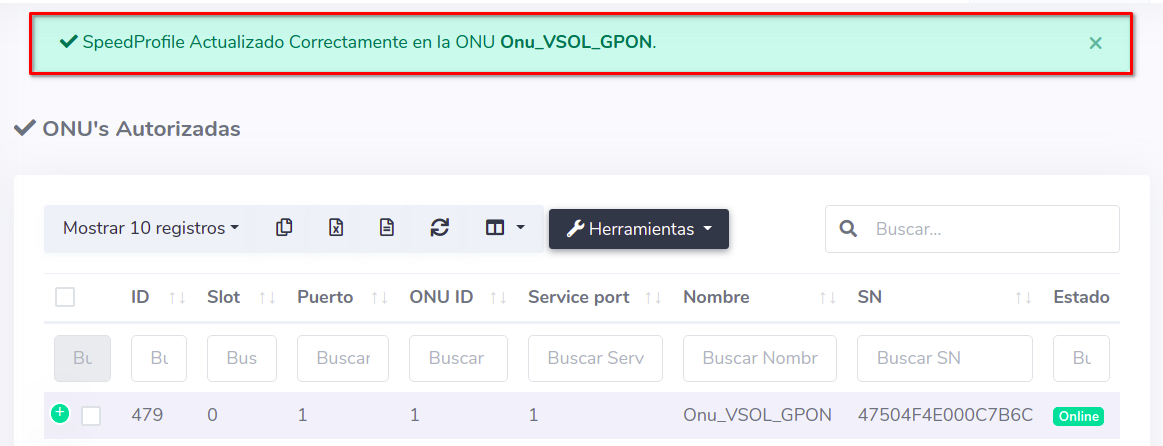 Para este ejemplo usaremos una ONU Autorizada que inicialmente tiene un Plan de 100 Megas, en este caso nosotros lo cambiaremos a un Plan de 25 Megas.