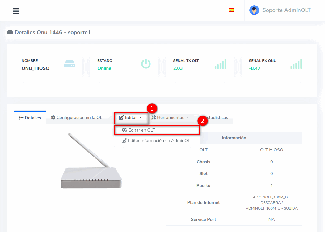 Dar click en el texto Editar en OLT que se encuentra en el botón con la leyenda Editar.