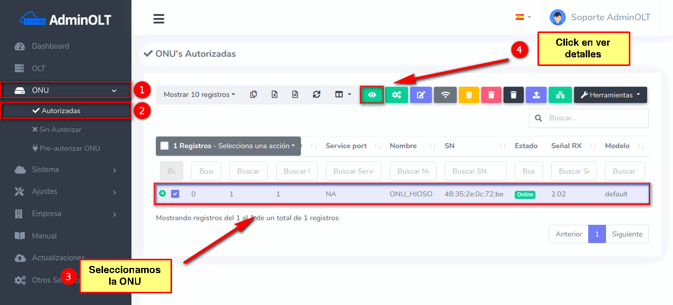 Tome en cuenta que el puerto PON de la OLT debe tener deshabilitados el modo NonAuth. Si tiene dudas sobre este tema puede consultar el siguiente manual; Configurar Puerto PON