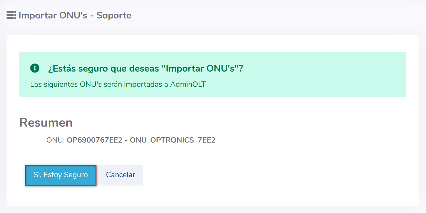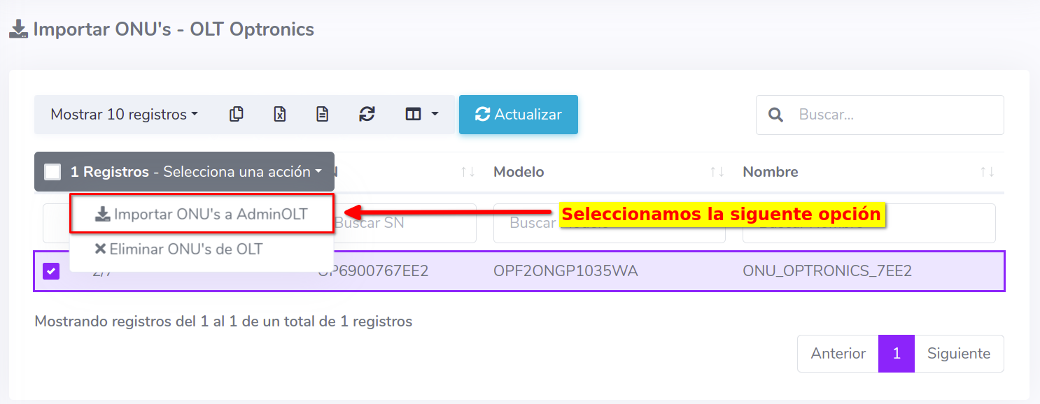 3Una vez que hayamos seleccionado los equipos, importamos las ONU's al sistema AdminOLT