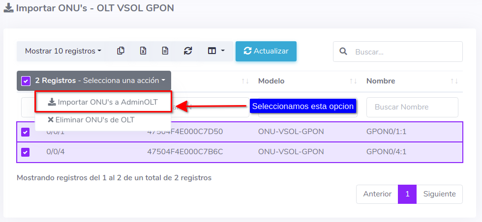 3Una vez que hayamos seleccionado los equipos, importamos las ONU's al sistema AdminOLT