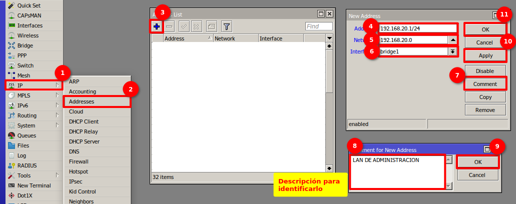 1 Nos dirigimos al apartado de Bridge en el menú de nuestro RouterBoard para generar la interfaz bridge1 y así poder agrupar los puertos que estarán trabajando en la red de la OLT.