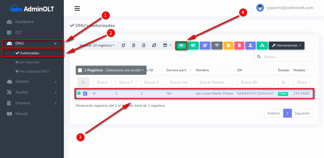 1Dirijase a la sección de ONU > Autorizadas y seleccione la ONU con la que desea trabajar.