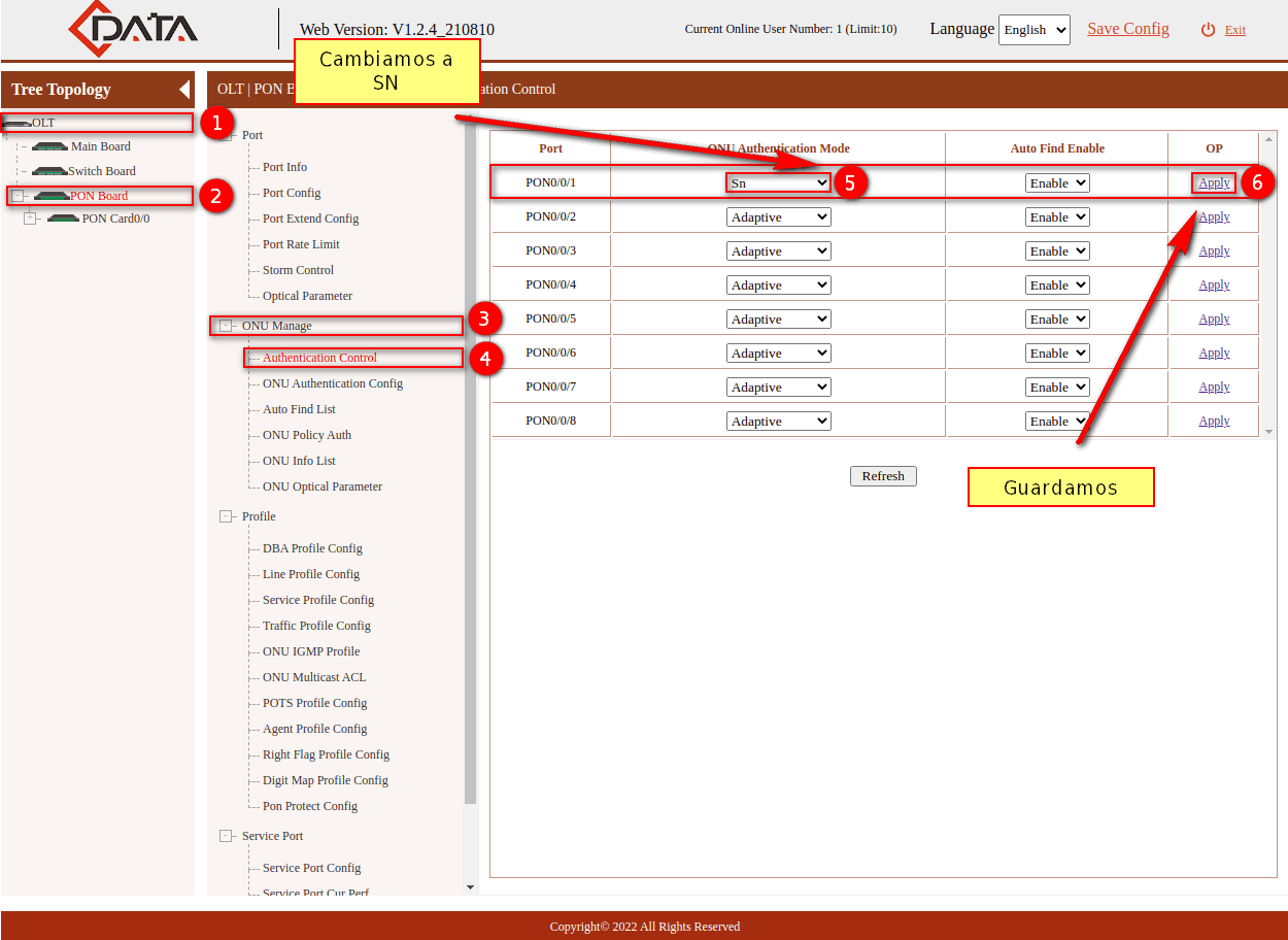 3 Modificamos el Modo de Autentificación del puerto PON
