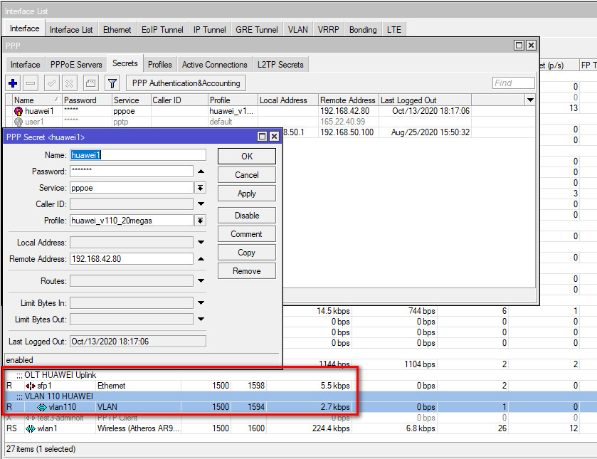 De igual forma se necesita ya tener el servidor PPP junto con su usuario. En este ejemplo usaremos un servidor en un dispositivo MikroTik.