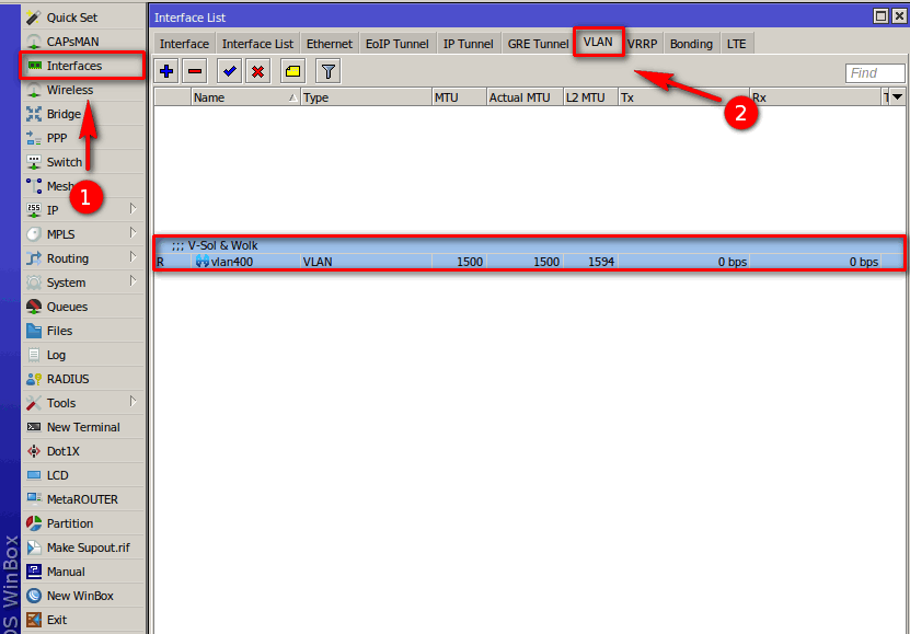 1 Para esto debemos dirigirnos en mikrotik a la sección de Interfaces > VLAN y agregar una VLAN con el puerto 400.