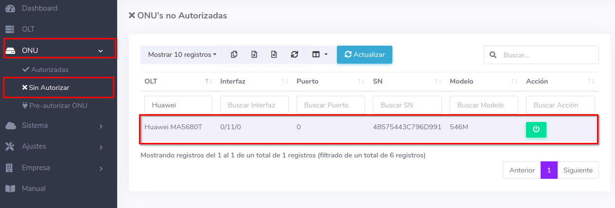 En AdminOLT podemos editar información de una ONU Autorizada en la OLT, supongamos que alguna de las ONUs que tenemos autorizadas en el sistema se estropea. Tomaremos como ejemplo esta situacion para explicar el propósito de esta función. Asi que en ese caso en AdminOLT al editar ONU por SN podemos tomar información de alguna ONU no Autorizada y usarla, sin perder la configuración inicial que teníamos.