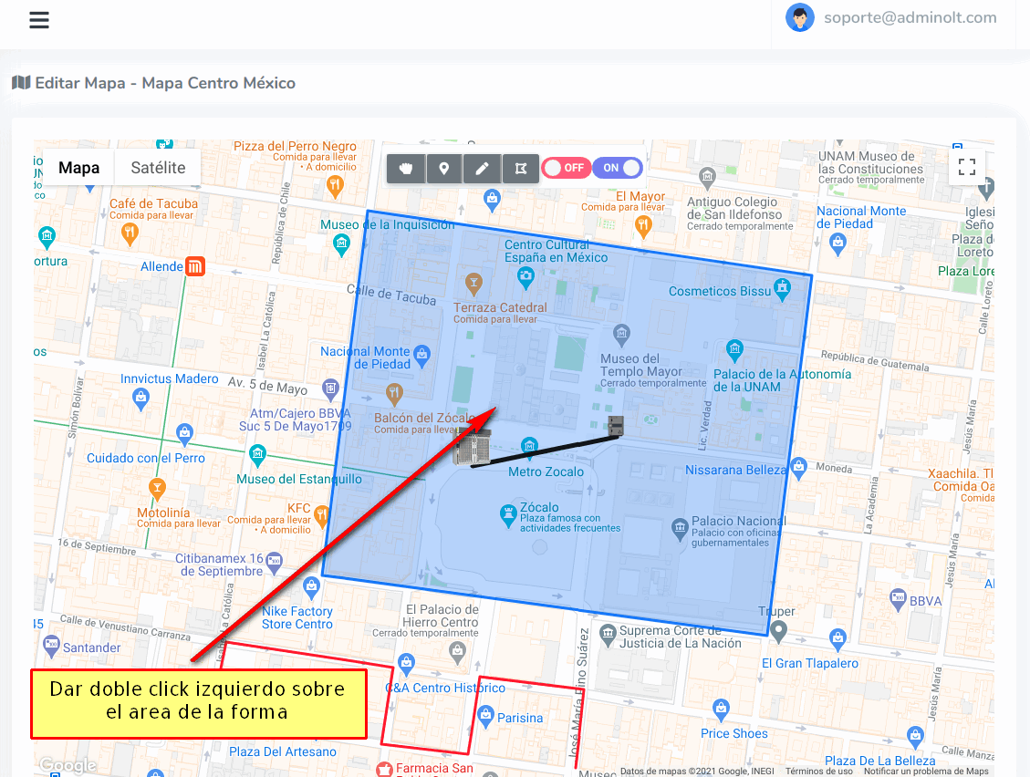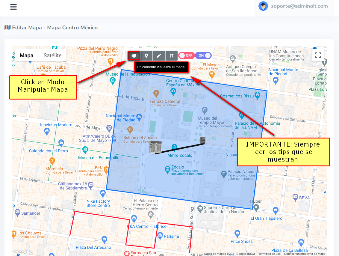 Una vez haya dibujado la Geozona que desea, para terminar de dibujar debemos dar click en la opción de Manipular Mapa.
