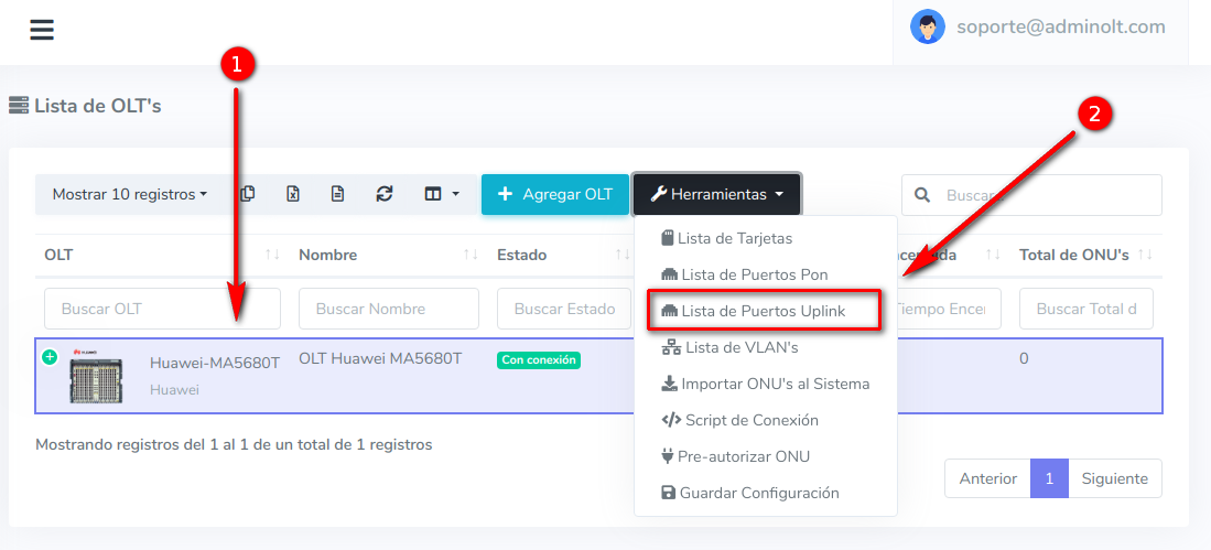 1Para habilitar los puertos Uplink, es necesario ir a la vista de "Lista OLT's" y seleccionar una OLT, despues elegir la opcion en herramientas "Puertos Uplink".
