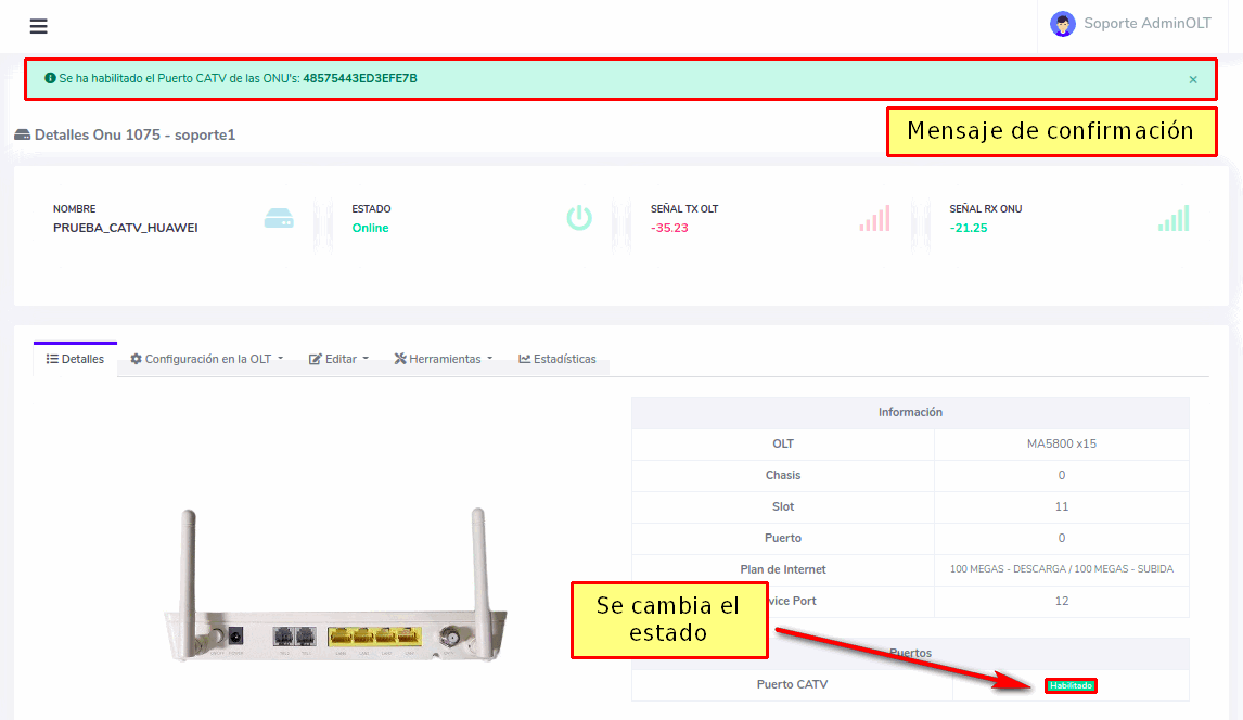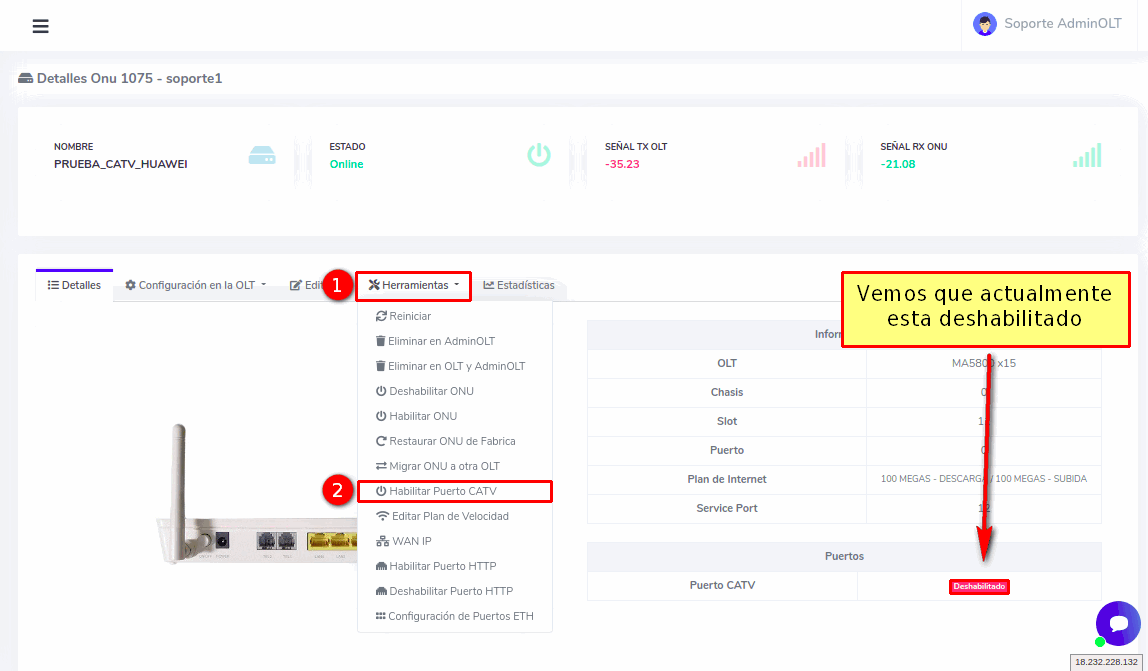 Desde AdminOLT se puede habilitar o deshabilitar el puerto CATV de las ONU's. Para esto puede seguir los siguientes pasos