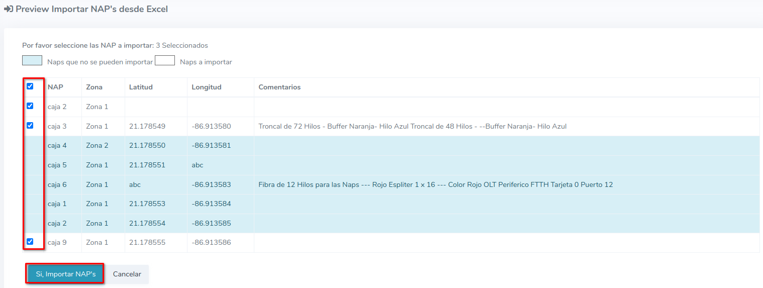 3A continuación un previo de los datos, en el cual mostrará un aviso a tomar en cuenta, también se le mostrará todas las Naps que están en el archivo y se le indicará cuáles Naps se pueden importar y cuáles no debido a un dato erróneo que tenga.