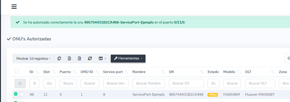 En AdminOLT es importante que las ONUs se encuentren con un service-port, si la ONU no cuenta con uno, el sistema no permitira al usuario realizar la importación de esta.