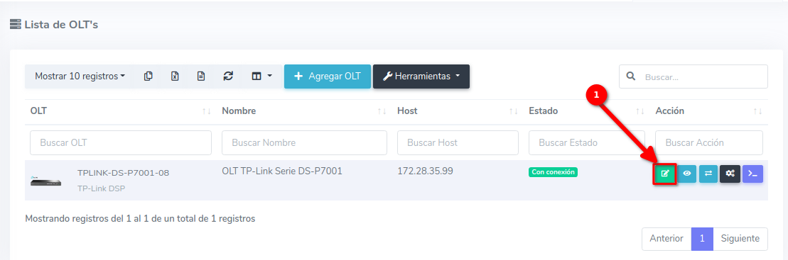 1 Para poder establecer la conexión de manera exitosa es necesario que generemos un script, para poder generarlo, nos dirigimos a nuestra OLT y seleccionamos la opción de editar.